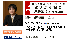 | 01 | 慶應義塾大学法学部 小論文必勝法!09年度以前 | 29:44 |     | 1,260円 |  |