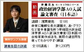 | 01 | 早稲田大学政治経済学部AO入試 論文審査(日本語) 必勝法 | 36:43 |   | 1,260円 |  |