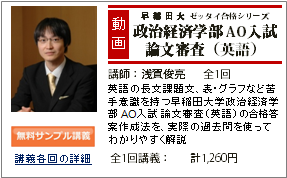 | 01 | 早稲田大学政治経済学部AO入試 論文審査(英語) 必勝法 | 33:43 |   | 1,260円 |  |