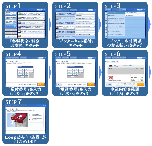 ローソン店内に設置されているLoppi (情報端末)を用いて、レジで支払う際に必要な「申込券」を入手してください。 操作はカンタン、画面に従ってタッチパネルを押すだけです。詳しくは下記をご覧下さい。 | |